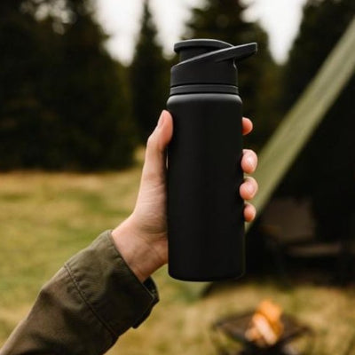 • gourde isotherme un litre blanche et noire tenue par une personne en-t-chirt noire